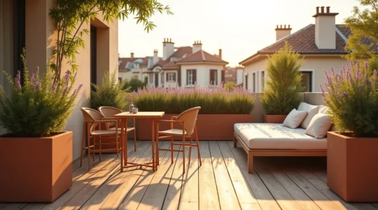 L’effet « Oasis » est réel : la transpiration végétale abaisse la température d’une terrasse de 2 à 4°C en plein été. Un mur végétal sur treillis (clématites, jasmin étoilé, chèvrefeuille) crée une isolation thermique naturelle tout en apportant verdure et parfum. Cet effet est particulièrement précieux sur les balcons exposés plein sud en ville, où le béton emmagasine la chaleur.