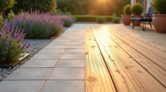 La circulation pieds nus en été impose de choisir des matériaux qui ne brûlent pas (évitez le métal et certaines pierres sombres), ne donnent pas d’échardes (attention aux bois mal entretenus), et restent praticables même mouillés. Le bois composite répond bien à ces critères, avec la promesse séduisante du « sans entretien ». Cette promesse est largement vraie : pas de ponçage, pas d’huile, juste un nettoyage occasionnel au savon noir.
