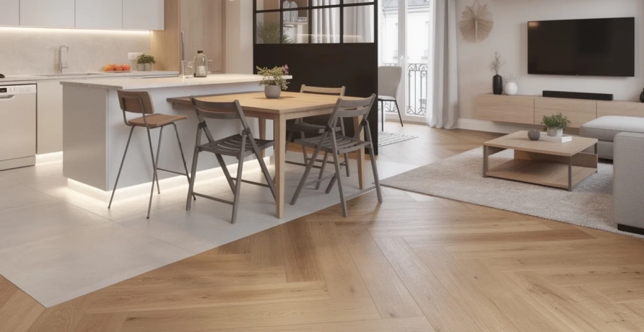 Dans une pièce de vie de 45m2, le sol devient un outil de zoning à part entière. L’association carrelage dans la cuisine et parquet dans le salon-salle à manger permet de délimiter les fonctions sans ériger de cloison. Le carrelage, plus résistant à l’eau et aux taches, s’impose naturellement dans l’espace cuisine, tandis que le parquet (ou un stratifié de qualité) apporte confort visuel et chaleur dans le coin salon. Pour un rendu harmonieux, choisissez des teintes proches et travaillez la transition avec un profilé discret ou une jonction en bâton rompu.