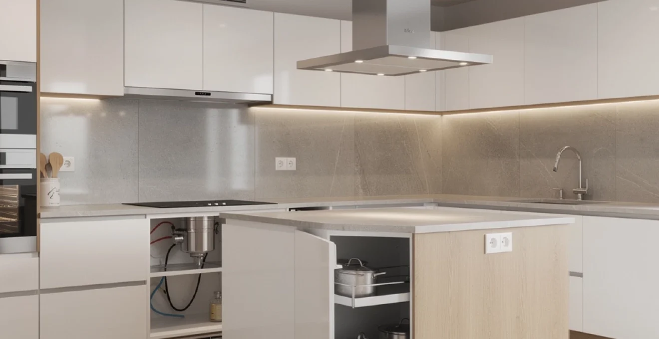 Sous le plan de travail, la gestion des évacuations et des alimentations conditionne la fonctionnalité de la cuisine. Dans un séjour-cuisine de 20m2, où l’on cherche à maximiser les rangements bas, il est crucial de regrouper au maximum les réseaux dans l’axe de l’évier et du lave-vaisselle. Cette compacité permet de libérer les autres caissons pour des tiroirs coulissants, bien plus ergonomiques que de simples tablettes.