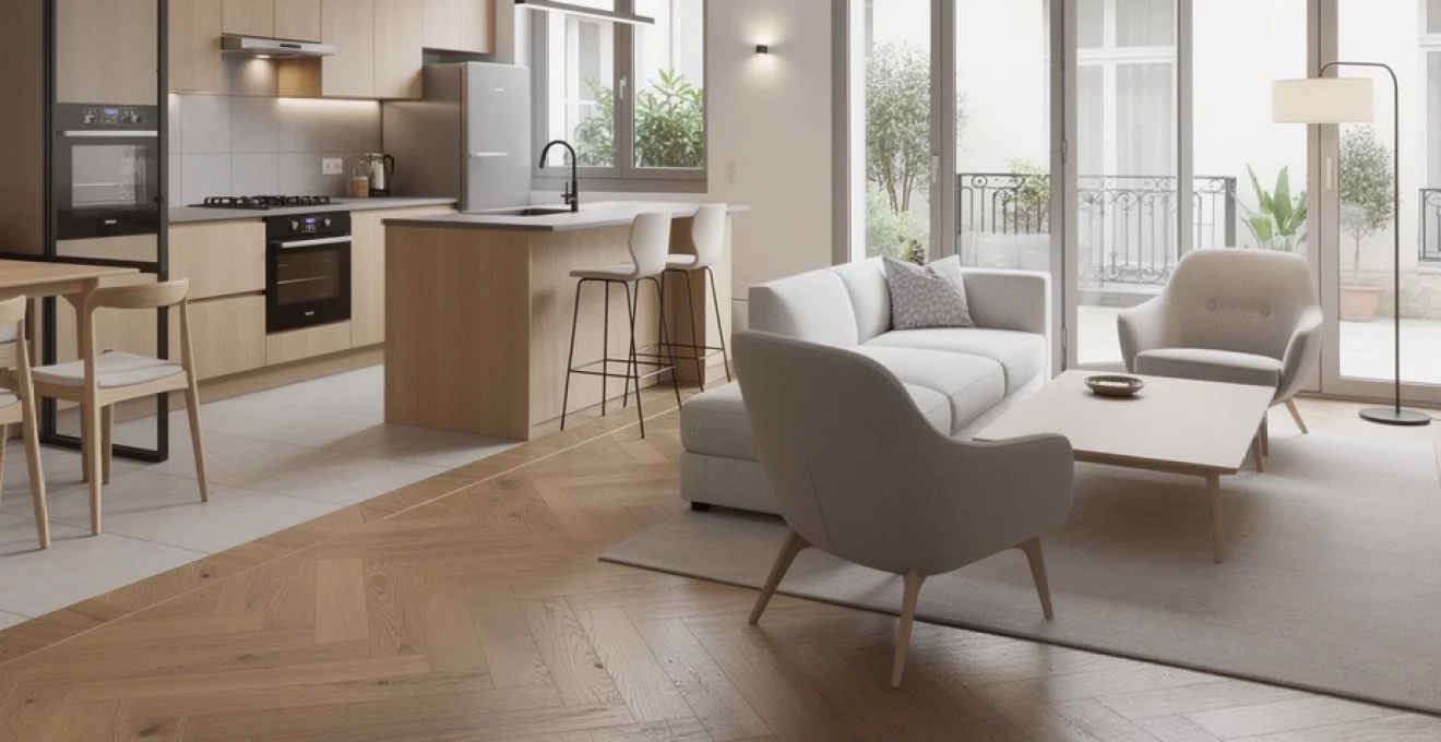 La tendance actuelle va aux transitions graphiques : carrelage hexagonal qui vient se fondre dans un parquet, découpe diagonale entre deux matériaux, ou encore différence de niveau avec une petite estrade côté salon ou cuisine. Attention toutefois à ne pas multiplier les effets sur 40m2 : un seul changement de matériau, travaillé proprement, suffit. L’essentiel est de veiller à ce que les teintes restent coordonnées : un carrelage gris perle associé à un parquet chêne clair, par exemple, crée une continuité douce qui relie cuisine et salon sans rupture brutale.
